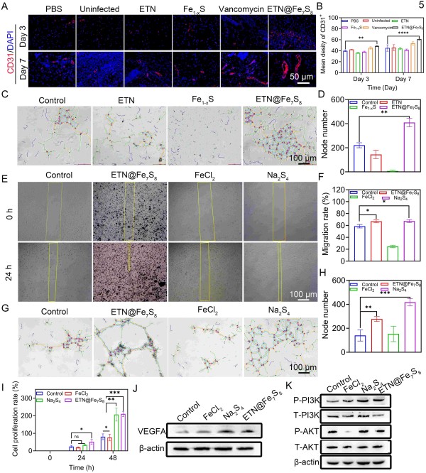 ETN@Fe7S8通过释放多硫激活PI3K/AKT通路,显著促进血管生成,全面优化伤口微环境,实现高效组织修复。