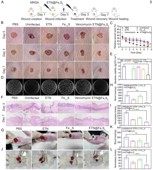 研究发现,该复合材料可在不依赖外部光源的条件下,通过释放Fe²⁺与多硫诱导铁死亡,强效杀灭耐甲氧西林金黄色葡萄球菌(MRSA);同时通过抑制NF-κB信号通路减轻炎症反应,并激活PI3K/AKT通路,促进血管新生与组织修复。在动物模型中,ETN@Fe₇S₈表现出优异的抗菌性、生物相容性与组织再生能力。本研究揭示了一种全新的多模式抗菌材料策略,从“抗菌—抗炎—修复”多维角度协同介入感染性创面的治疗过程,为多功能纳米材料在感染与组织再生领域的应用提供了理论基础与实践路径。