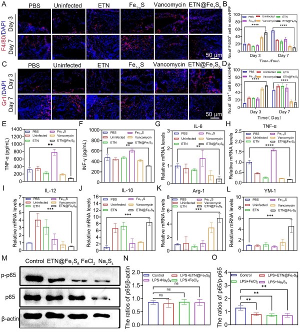 机制研究发现,ETN@Fe7S8通过调控巨噬细胞极化和NF-κB信号通路发挥抗炎作用,从而加速伤口修复。Fe2+和多硫协同抑制NF-κB磷酸化(p-p65下调),通过铁死亡机制和硫化物介导的抗炎信号通路共同促进炎症消退和组织再生。